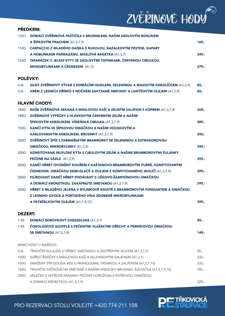 Čeká Vás bohaté menu plné chutí lesa – od kančího a jeleního masa až po delikatesy z dančího či srnčího. Vše připravíme s láskou a špetkou moderní kuchyně, tak jak to u nás máte rádi 🍽️. Nebudou chybět ani oblíbené domácí speciality 🏠🍲, které k této akci neodmyslitelně patří.